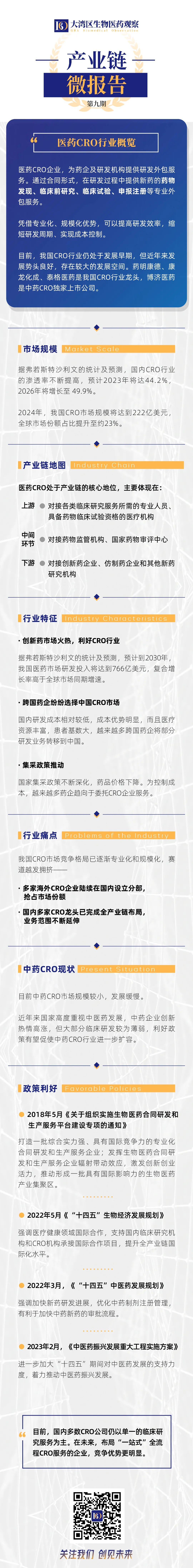 据弗若斯特沙利文的统计及预测,预计到2030年,我国医药市场研发投入将达到766亿美元,复合增长率高于全球市场同期增速。得益于医药研发市场的火热,国内 CRO行业的渗透率不断提高。据弗若斯特沙利文统计,2016年中国CRO市场渗透率为29.8%,到2023年将达44.2%,预计2026年将增长至 49.9%。整个CRO行业景气度和医药研发企业发展紧密关联。这也导致,一旦医药板块热度下降,CRO行业也会随之波动。此外,国家集采政策不断深化,药品价格下降。为控制成本,越来越多药企趋向于委托CRO企业服务。目前,我国CRO市场竞争格局已逐渐专业化和规模化,赛道越发拥挤。目前,多家海外CRO企业陆续在国内设立分部,抢占市场份额。同时,国内多家CRO龙头,如药明康德、泰格医药等已完成全产业链布局,业务范围不断延伸。马仁强表示,目前,国内多数CRO公司仍以单一的临床研究服务为主。而博济医药全流程“一站式”CRO服务优势明显。中药研发服务一直是博济医药的特色服务领域,作为中药CRO领军企业,博济医药优势明显,不仅有资深中医专家,中药临床项目经验丰富,且与中医临床试验机构合作紧密。中药CRO服务体系完善。根据弗若斯特沙利文的数据预测,中国CRO市场规模将从2019年的68亿美元上升至2024年的222亿美元。但中药CRO市场规模较小,发展缓慢。根据国家药监局药品审评中心(CDE)数据,创新中药2021年申请临床试验数量不足50件,而化学药达1134件,创新中药临床试验规模低。“它的原材料有一定的生长周期,质量受产地影响,所以中药制作门槛比较高,只能做精品,产量无法像化学药那样快速提升。“在国内创新药的数量上,中药占比可能不到20%。”马仁强表示。但他始终看好中药CRO的前景。“目前化学药某种程度上是在下坡路,中药是在上坡路。”近年来国家高度重视中医药发展,利好政策有望促使中药CRO行业进一步扩容。比如国家药监局在今年2月份发布的《中药注册管理专门规定》——明确中药创新药、中药改良型新药、古代经典名方与同名同方药等临床路径,可缩短临床试验周期,更快上市。●古代经典名方新药免临床获批后需开展上市后临床研究●要求说明书安全性内容不明确并在2026年7月1日后尚未修订的中成药,依法不予再注册。